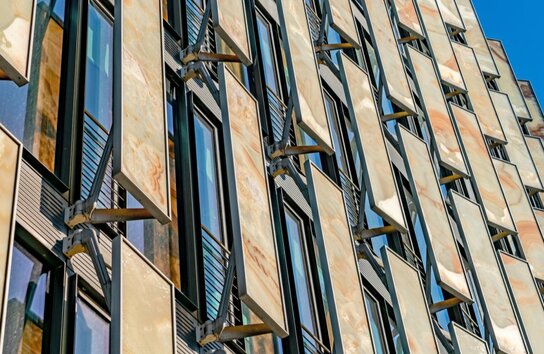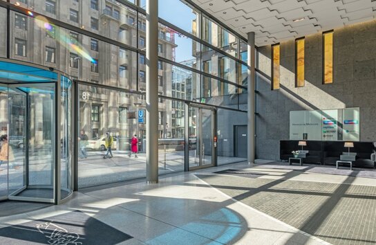 - Ansprechende, hochwertige Architektur mit innovativer Fassadentechnik durch transluzente Steinpaneele aus Onyx; hohe Repräsentativität durch große Eingangslobby mit 8 m hoher Glasfront
