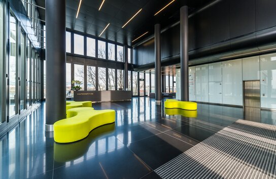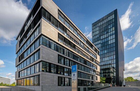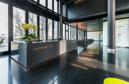 Arbeiten direkt an der Spitze des Medienhafens – das Büro-Hochhaus an der Hafenspitze zeichnet sich durch einzigartige Architektur aus und gilt als eines der modernen Wahrzeichen Düsseldorfs.